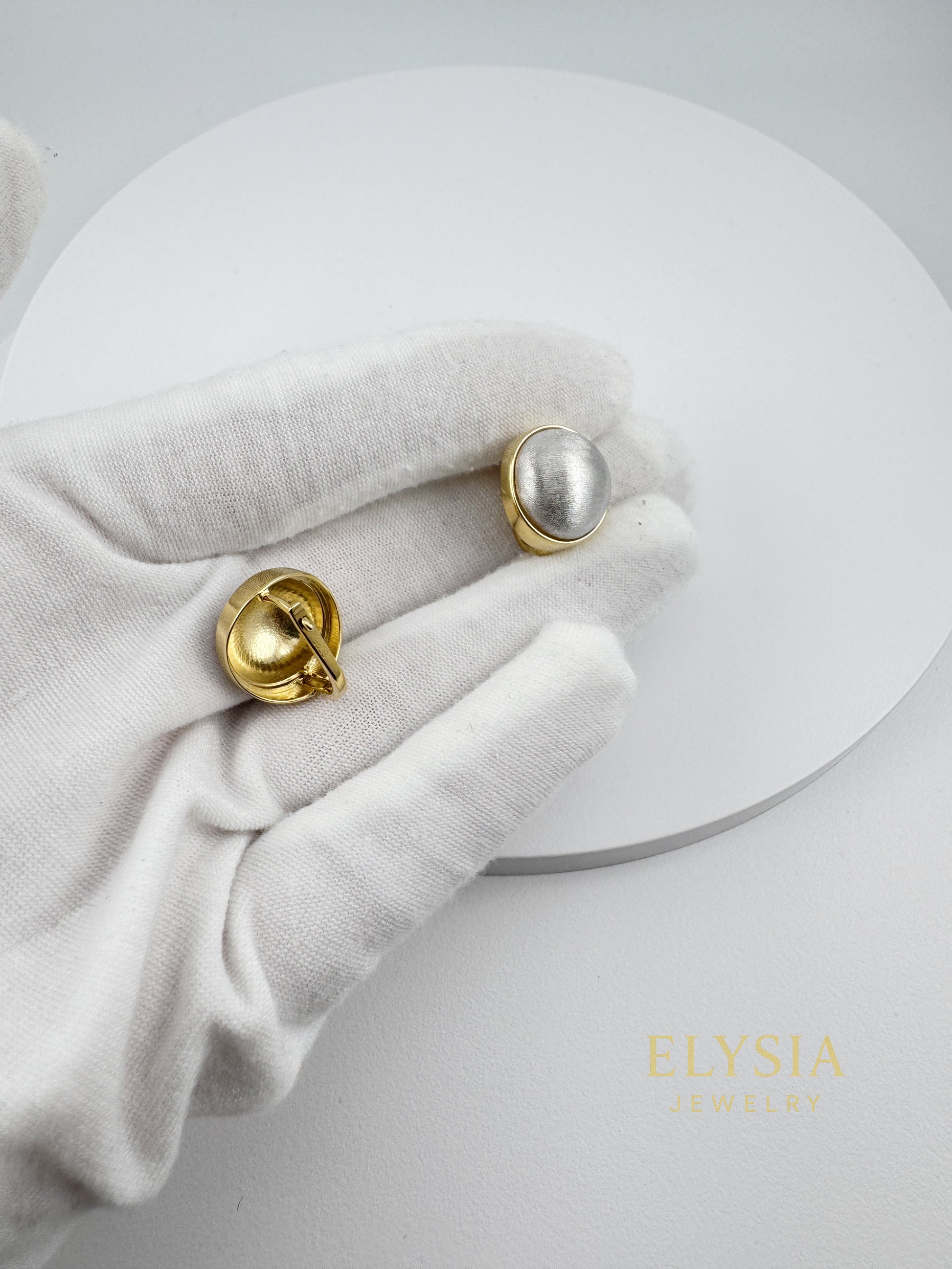 The satin-textured dome creates a soft, elegant contrast with the polished gold frame — a true quiet-luxury statement for everyday wear.