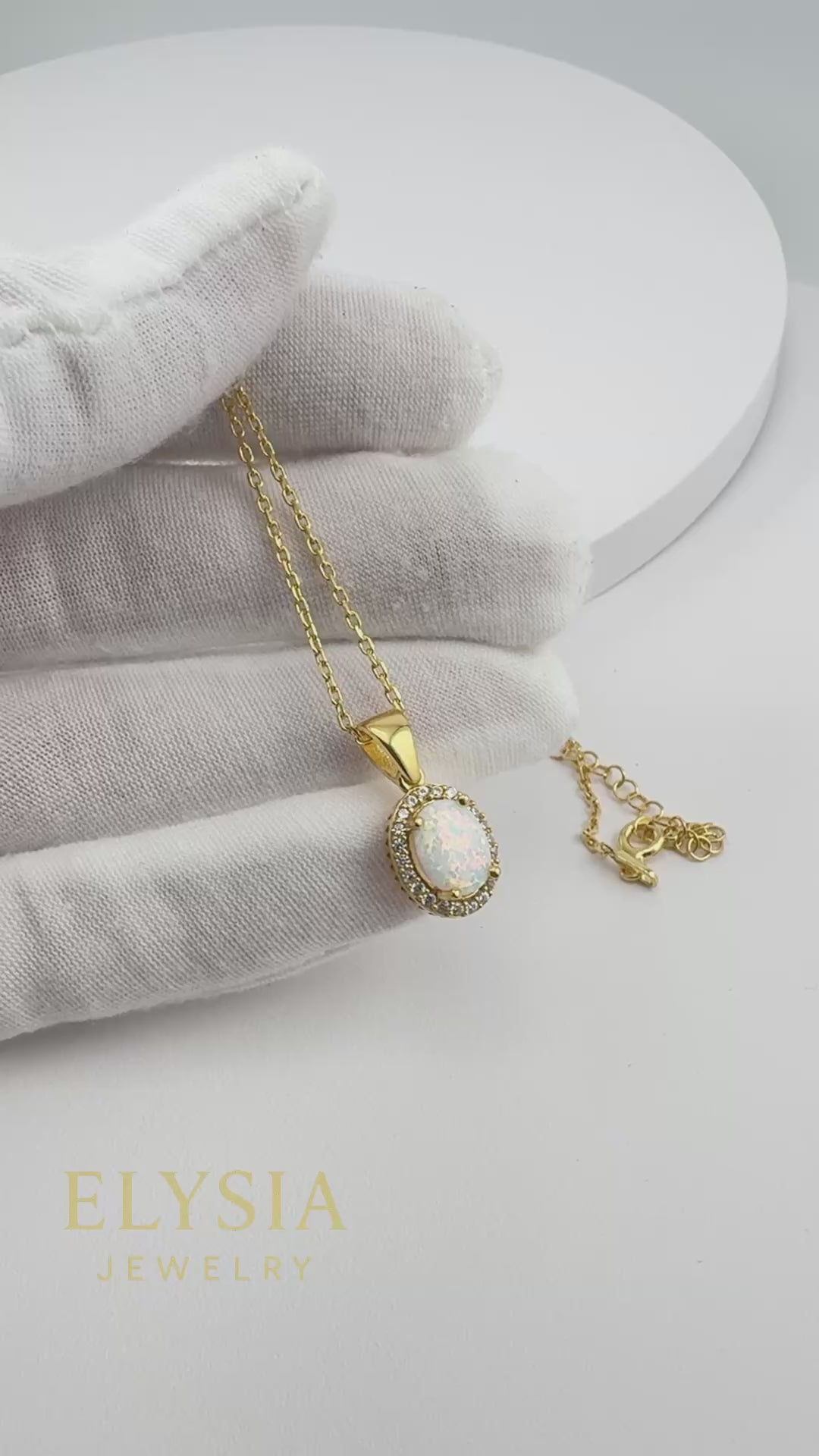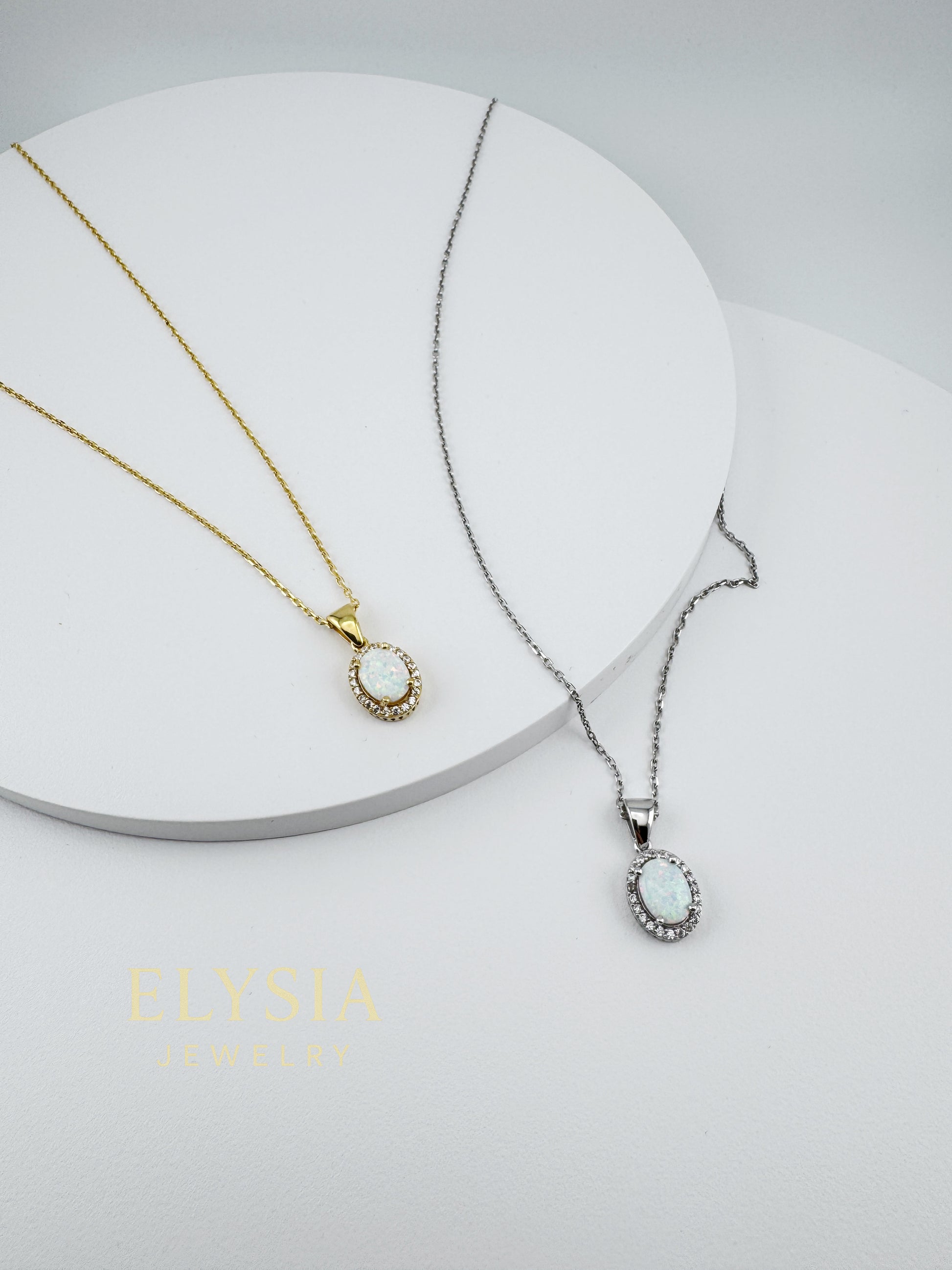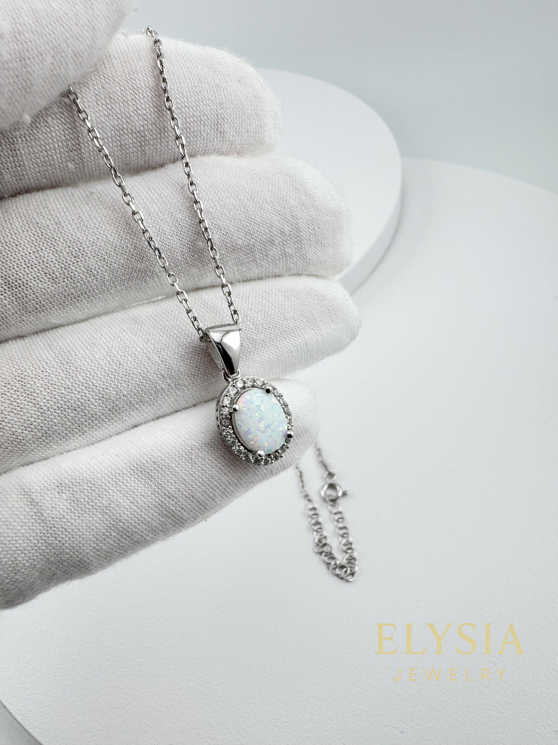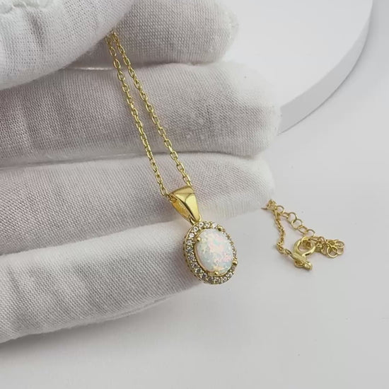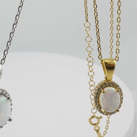 This handcrafted necklace features a luminous white opal set in a classic oval halo design, made from high-quality 925 sterling silver and finished with premium rhodium or 18K gold plating for lasting brilliance.